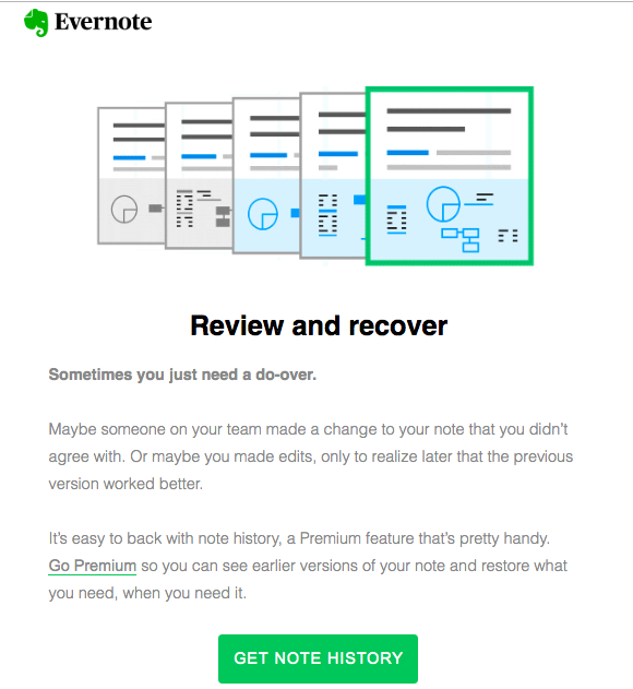 Evernote does a good job of upselling outside their product as well. In the email below, they focus on a single premium feature to entice free users. The email leads with the benefits of the feature—users can clearly see how note history could positively impact their workflow—rather than a simple money grab.