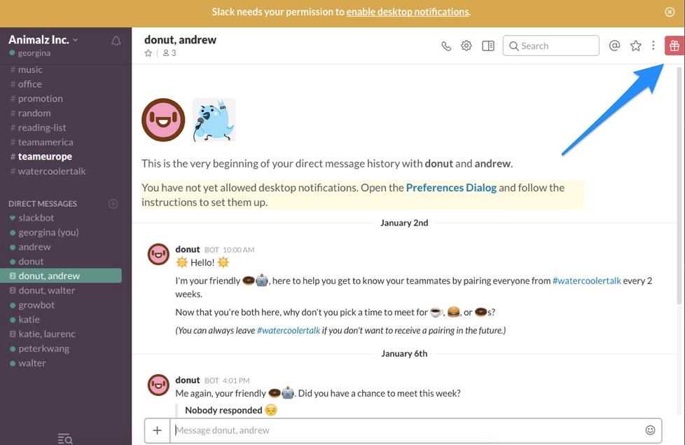 For example, Slack is full of emojis, colors, and notifications. In order for their in-app updates to stand out, they used a little red gift icon in the top-right corner. When users clicked on the red box, a sidebar would appear with the most relevant product updates (like a new video calling feature or threaded-messaging).