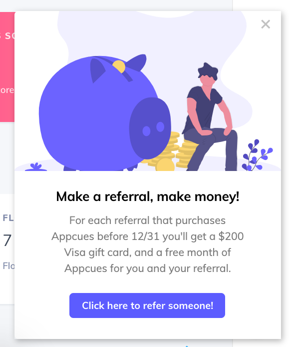We knew our best customers could also be our best marketers, if we could figure out a scalable way to leverage their enthusiasm for our product. To help our team identify areas of opportunity, we launched a referral campaign that offered customers an incentive (a $200 gift card plus a free month of Appcues) for referring colleagues and friends to the platform.