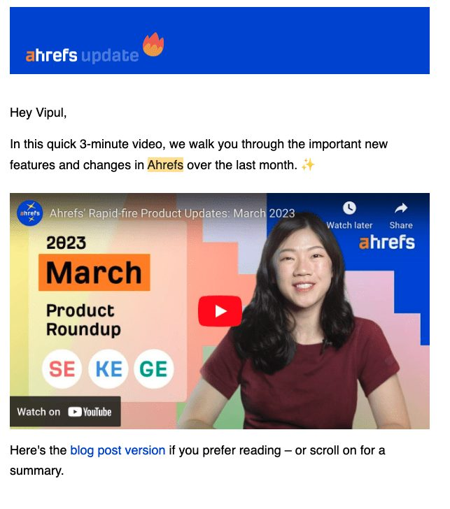 When it comes to announcing new features, Ahrefs shows a keen understanding of its audience's diverse preferences. Their May 2023 product update is a masterclass in using dual channels: a compelling YouTube video embedded right in the email for those who prefer a quick, visual overview and a detailed blog post for users who love to dive deep into the specifics.