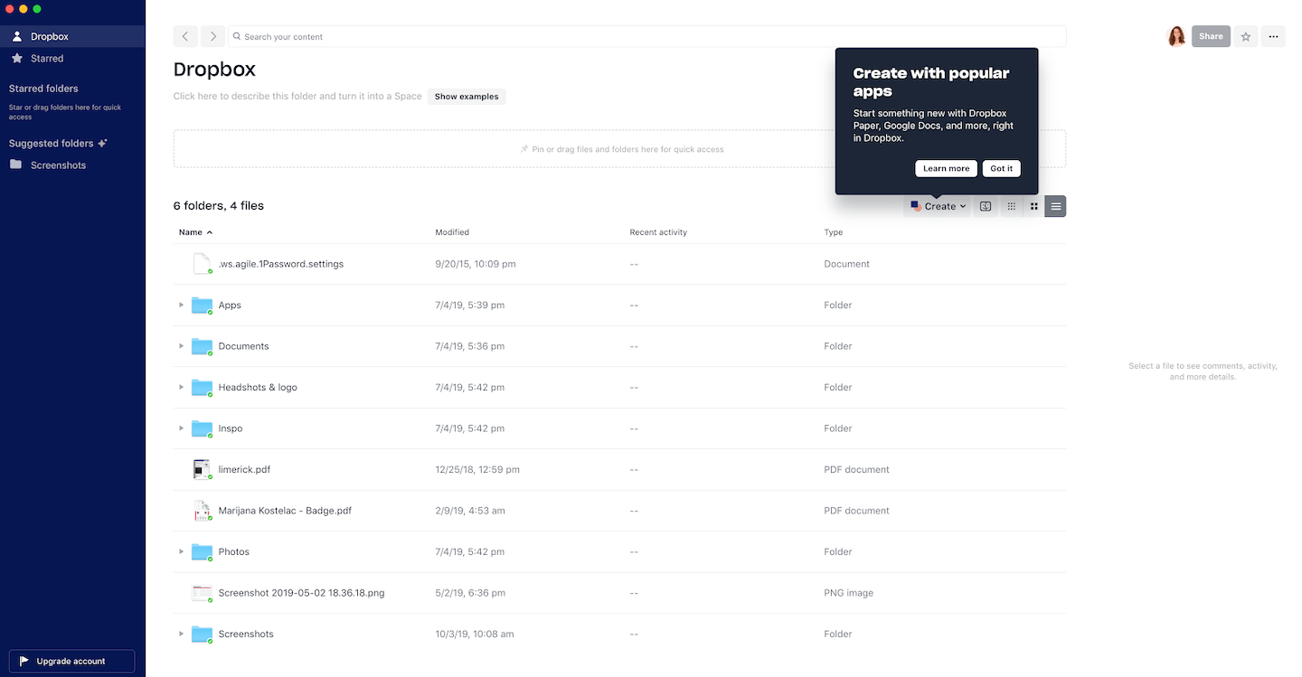 After greeting returning users with a simple, high-contrast welcome modal, Dropbox uses a tooltip to call out 2 specific tools—Dropbox Paper and Google Docs—and show users where to click to get started.