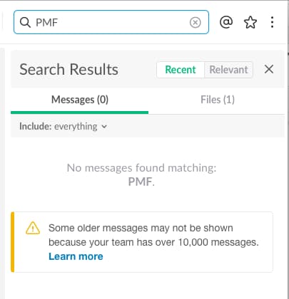 For example, Slack uses in-app messaging to encourage users to upgrade to a paid plan. This messaging is seamless and crazy effective, with paid membership increasing by 25% between 2019 and 2020. This is one of the first prompts that users see once their team hits the 10k searchable message limit for free plans: