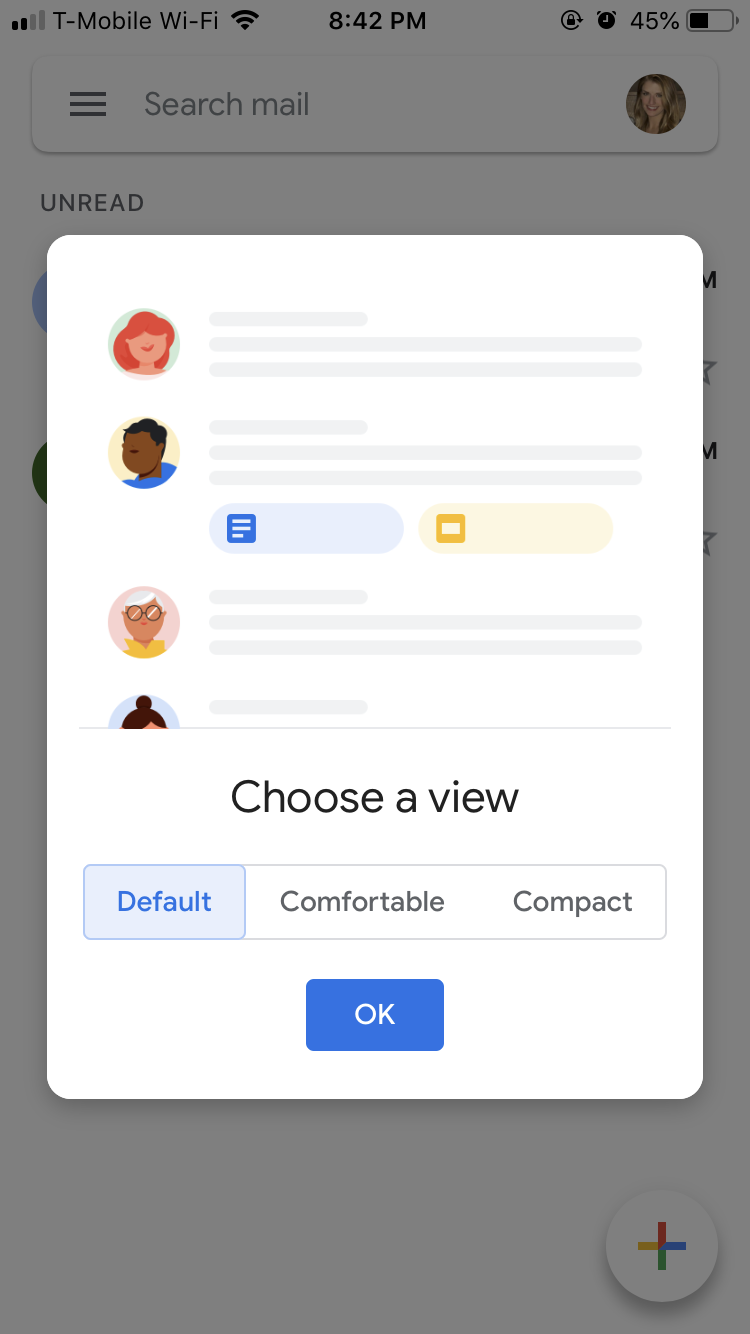 Gmail effectively used an overlay in-app message to relay some very important news to users—their UI got a fresh makeover with 3 different layout options to choose from. In this example, Gmail hits all the right notes with consistent branding and succinct copy that creates a compact onboarding experience that excites and informs users.