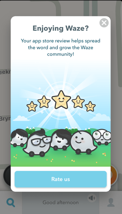 Waze’s colorful approach to an app rating request is delightfully different.It’s design is unlike any standard rating request, and it’s this distinction that gets the user to pause for a moment and consume the message.