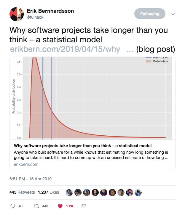 Erik Bernhardsson, CTO at Better.com, wrote an incredible article (and statistical model) about why we’re so bad at predicting how long software projects will take.