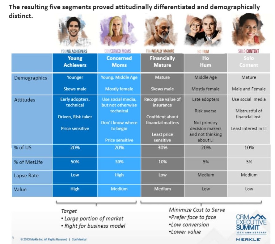 This example not only shows us one way to create buyer personas but also shows us what the next step is: a strategy based on your findings. In MetLife’s case, they identified their two most high-valued segments, “Young Achievers” and “Concerned Moms,” and separated them from low-priority segments. This way, they focus more of their marketing efforts on the segments with a higher ROI.