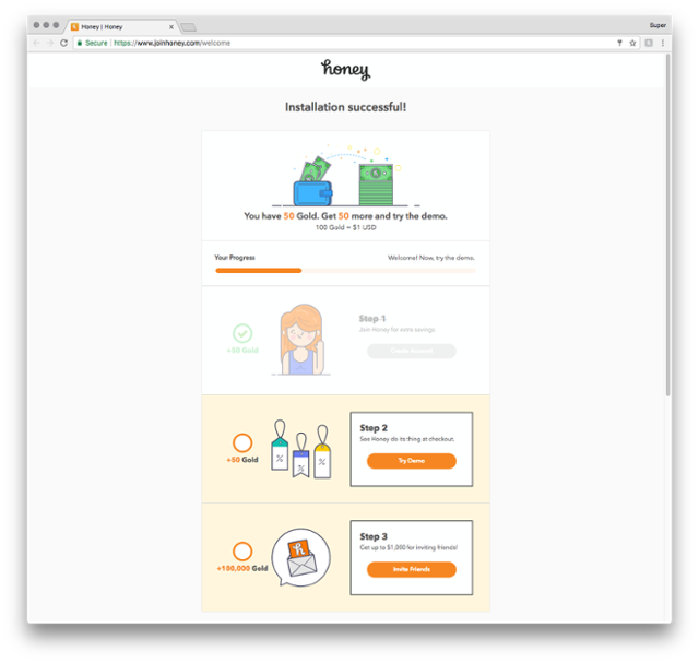 That leads to a call-to-action that encourages users to try a demo of Honey. Instead of waiting around for new users to purchase something on their own, this demo simulates Honey in action: