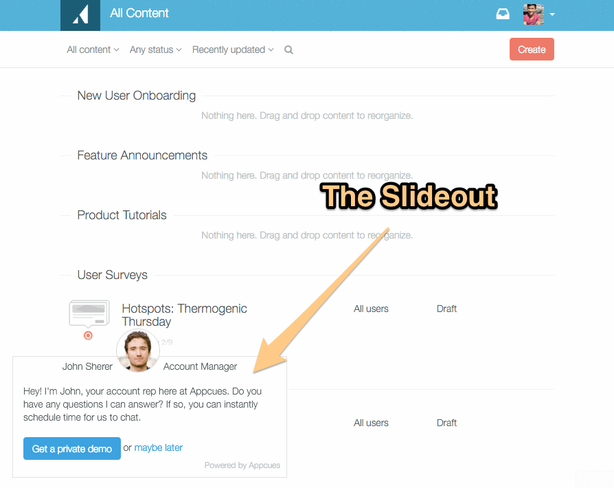 At Appcues, we love to build effective UI patterns to help you engage your users in-product. We had so much success with this demo slideout that we created a Slideout tool for you to do the same.