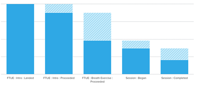 In this mock data from Calm, a meditation app that uses Amplitude to measure user onboarding, the conversion rate between steps 2 and 3 is the lowest—a sign that we should investigate what’s happening here.