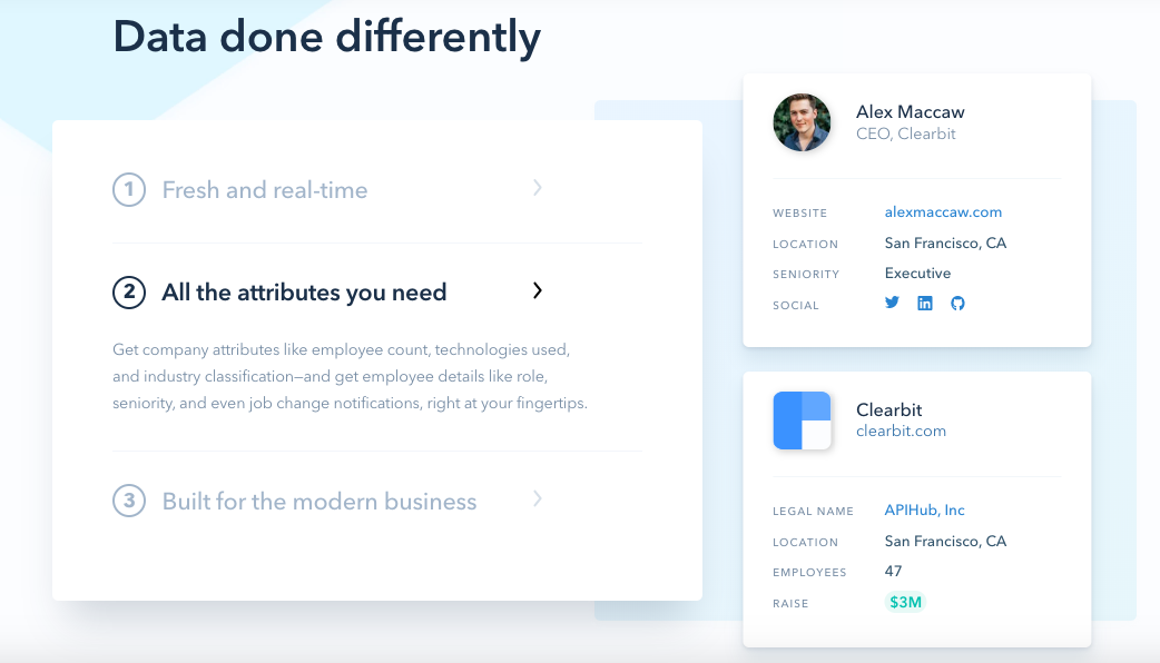 Clearbit can provide you with essential data like location, job title, industry, and more. Users have stated that Clearbit saves them time in tailoring their website for their ideal customers and in finding and qualifying leads.