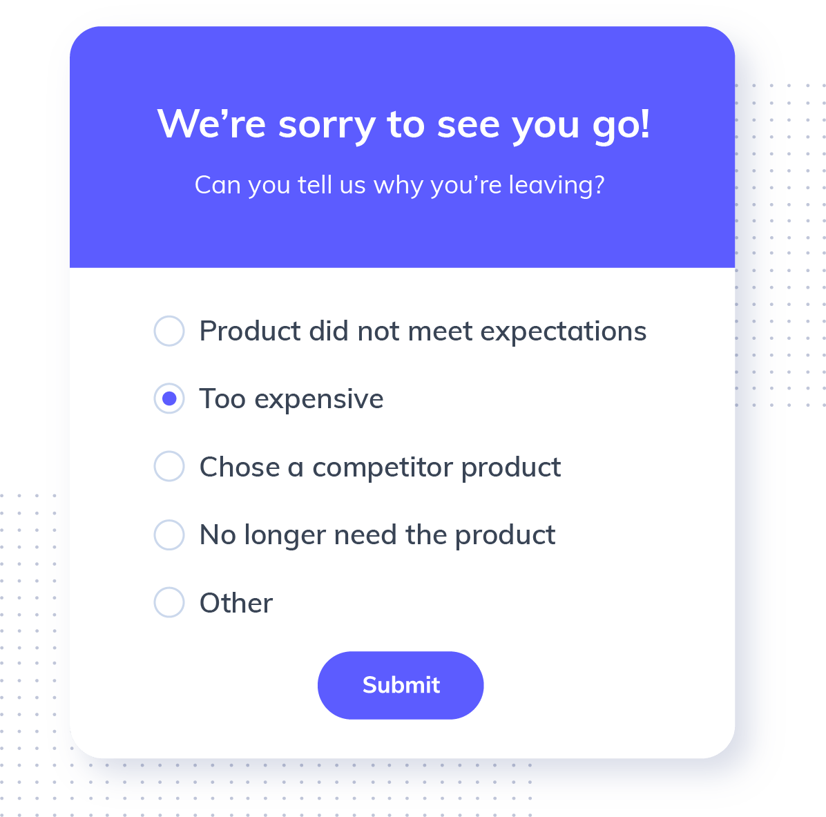 When customers deactivate their accounts, use in-app microsurveys to ask why. The answers will likely be far more varied than what you can see in product behavioral data alone. You may find that customers leave because your product isn’t within their budget or their needs change.